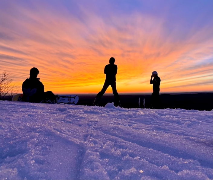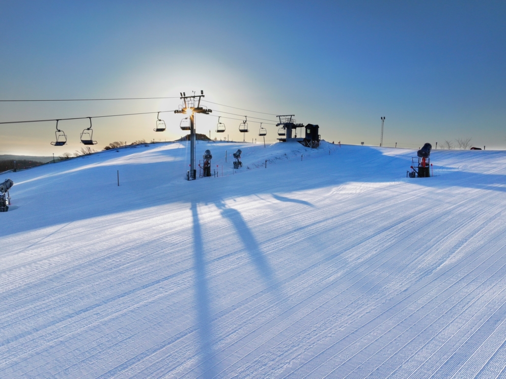 • A wide shot of a snowy ski slope at sunset, with a person on a snowmobile driving up the gentle incline toward a ski lift building on the left. The sun is setting brightly on the right, casting warm light across the clouds and the distant horizon.